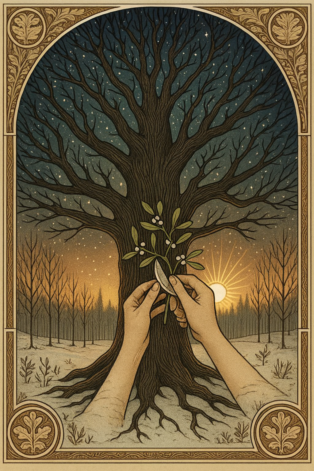 La lutte mythique entre le Roi Chêne et le Roi Houx traduit ce passage intérieur : la lumière croissante, discrète mais invincible, prend le relais de l’ombre. Ainsi, Alban Arthan nous enseigne que toute obscurité porte en elle son point d’inflexion, que le renouveau est une loi sacrée de l’univers, et que le Soleil – qu’on le voie comme astre, symbole ou principe divin – renaît d’abord dans le cœur des êtres avant de se lever dans le ciel.